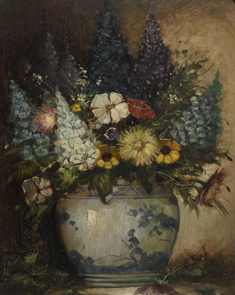 Verschiedene Blumen in einem bunten Strauß in Keramikvase. Zwei kleine Defekte.