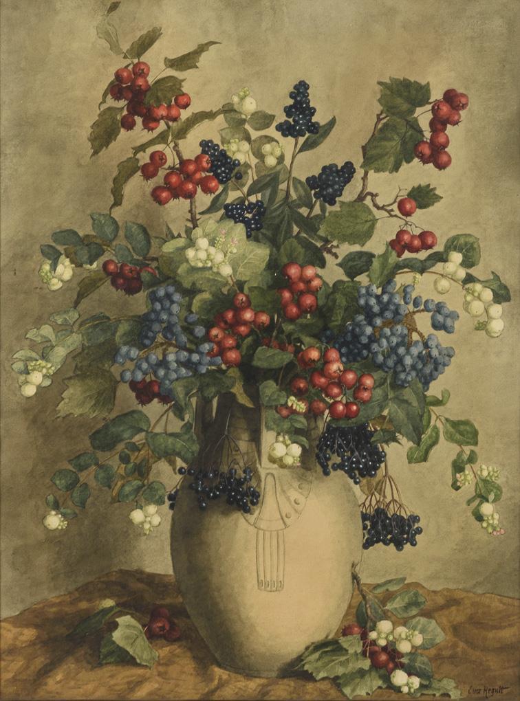 Großer Strauß aus verschiedenen Beeren in heller Art-déco-Vase.