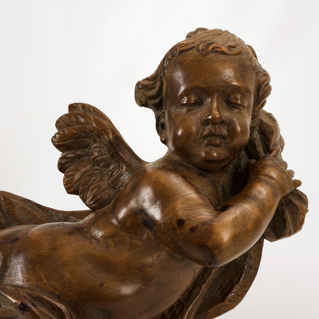 Annähernd vollplastische Figur des nackten Puttos, der in dynamischer Bewegung vor dem Tuch als Hintergrund gleichsam schwebt. Minimale Alters-/Gebrauchsspuren.