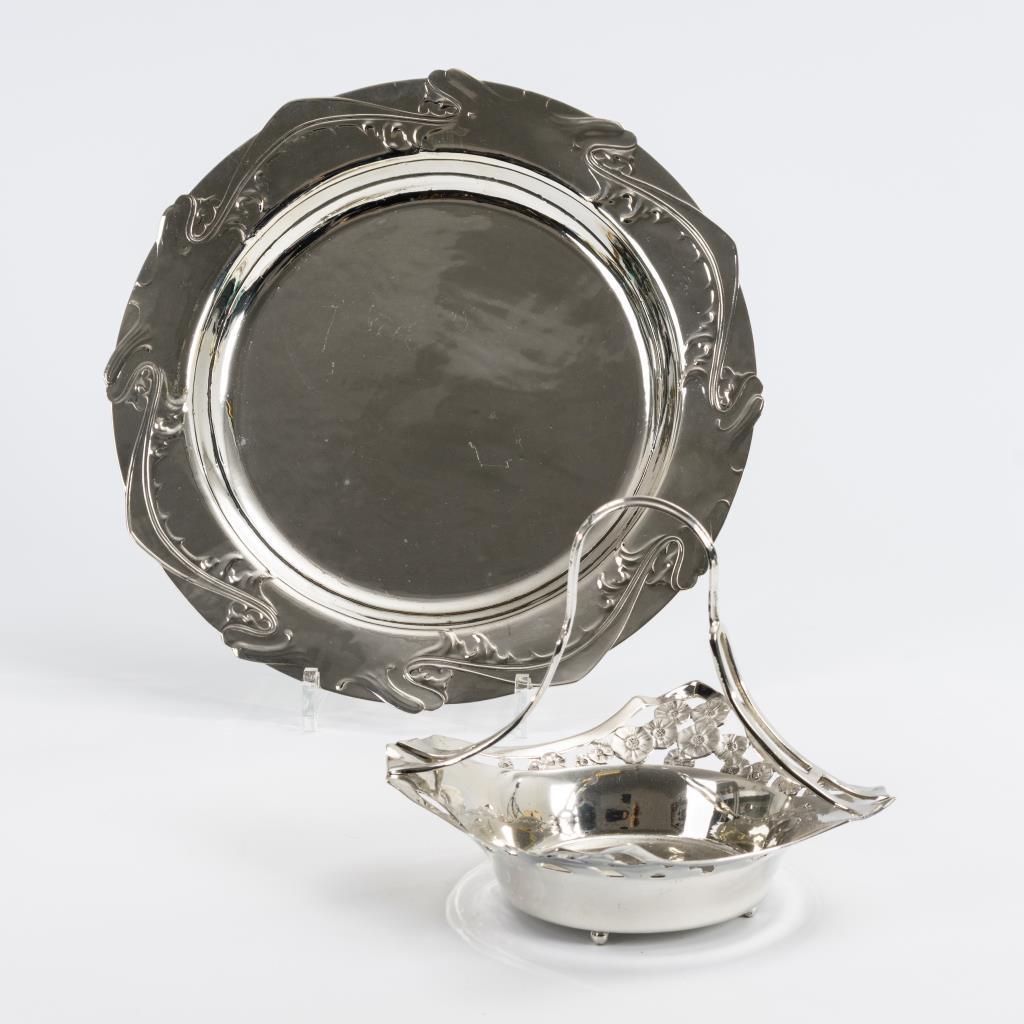 Platte mit stilisiertem Distelrelief (Lichtinger München?, Entwurf August Endell?); Henkelschale mit Blüten. Minimale Lötreparatur an der Schale.