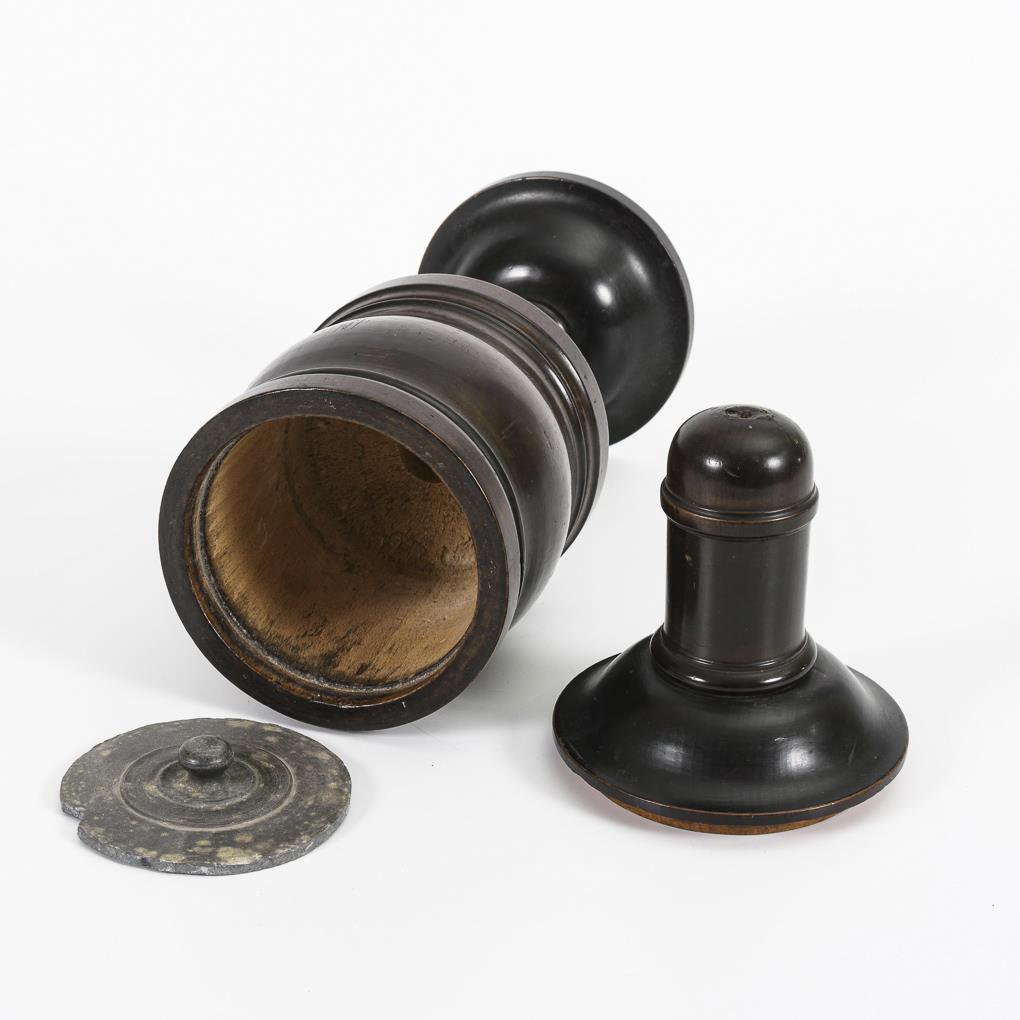 Pokalartiger Drechselbehälter mit Fidibusbehälter auf dem Passdeckel; innen Binnendeckel aus Zinn. Bekrönung fehlt, Binnendeckel mit Kerbe.