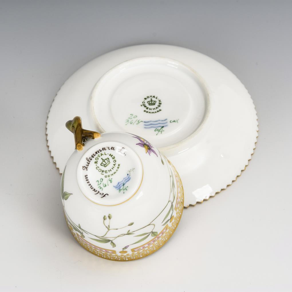 Tasse mit Asthenkel und Untertasse mit Zackenrand. Auf der Tasse die unterseitig bezeichnete Darstellung des Bittersüßen Nachtschattens. 1 Zacke minimal bestoßen.