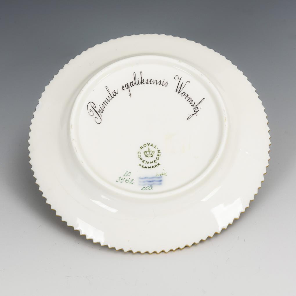 Teller mit Zackenrand und der unterseitig lateinisch bezeichneten Darstellung der Grönland-Primel. Unterseitiger Randchip.