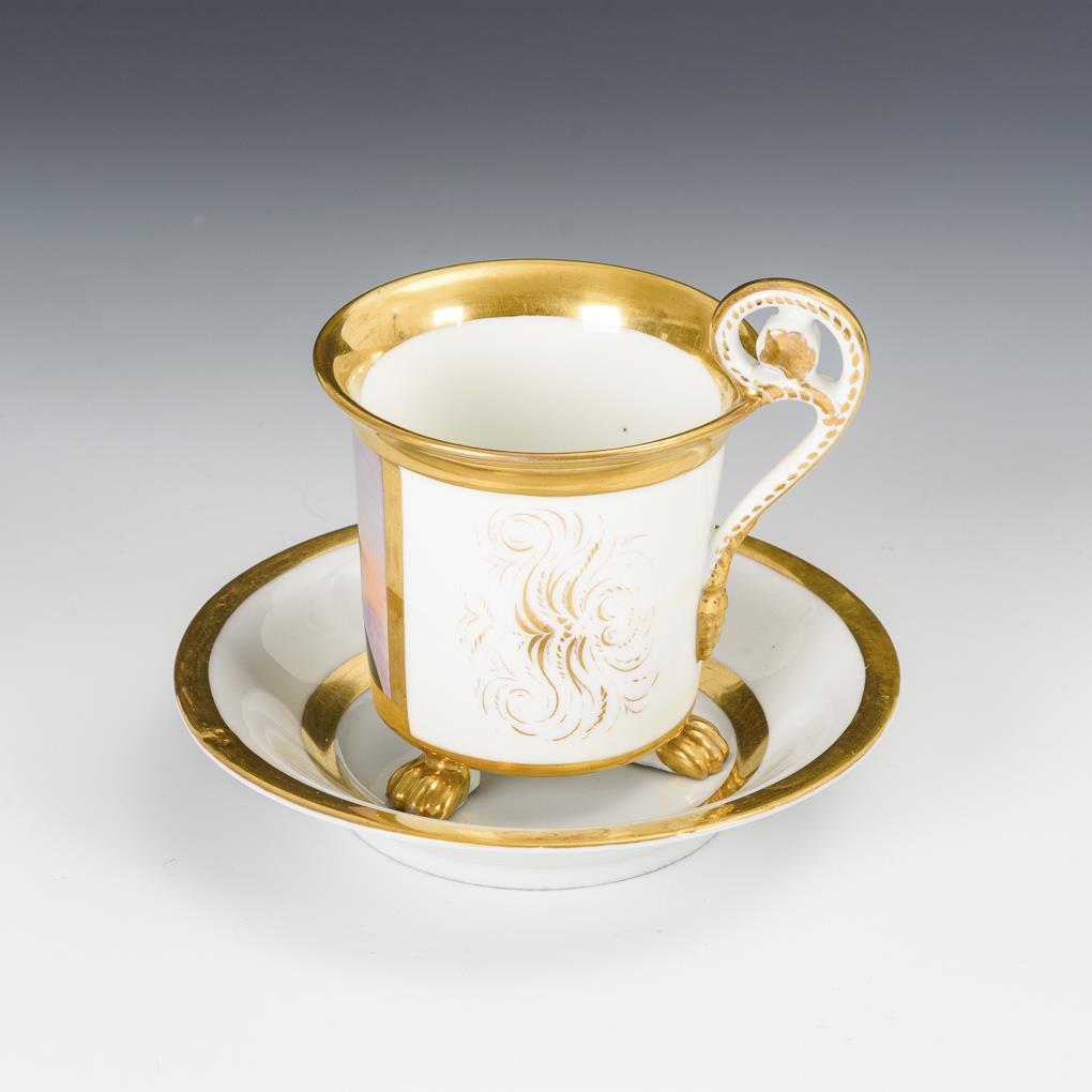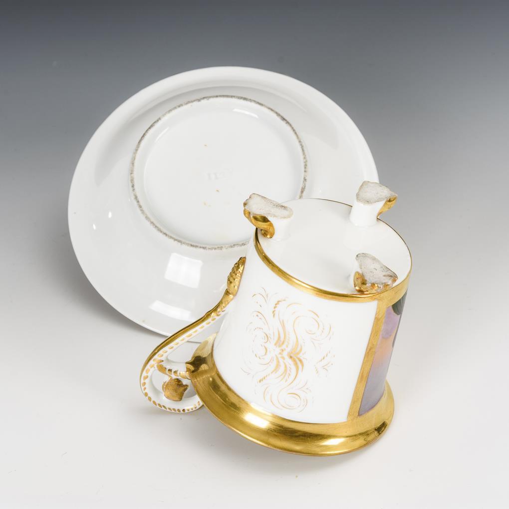 Polychrom bemalt, goldstaffiert. H Tasse 11,5 cm, Ø originale Untertasse 15 cm.