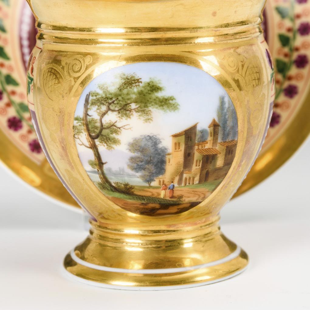 Gefußte Glockentasse mit Schwanenkopfhenkel. Teils ornamental radierter Goldfond, beigefarbener und bordeauxfarbener Teilfond mit Floralmalerei, schauseitig auf der Tasse sowie auf der Untertasse ein Medaillon mit einer idealen Landschaft mit Architektur und teils mit Figurenstaffage. Minimaler Goldabrieb im Untertassenspiegel.