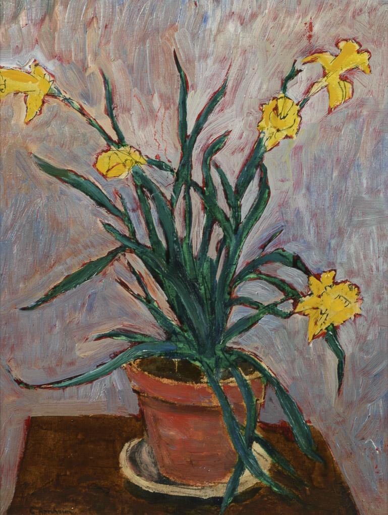 Die Blumen in einem Topf vor heller Wand.