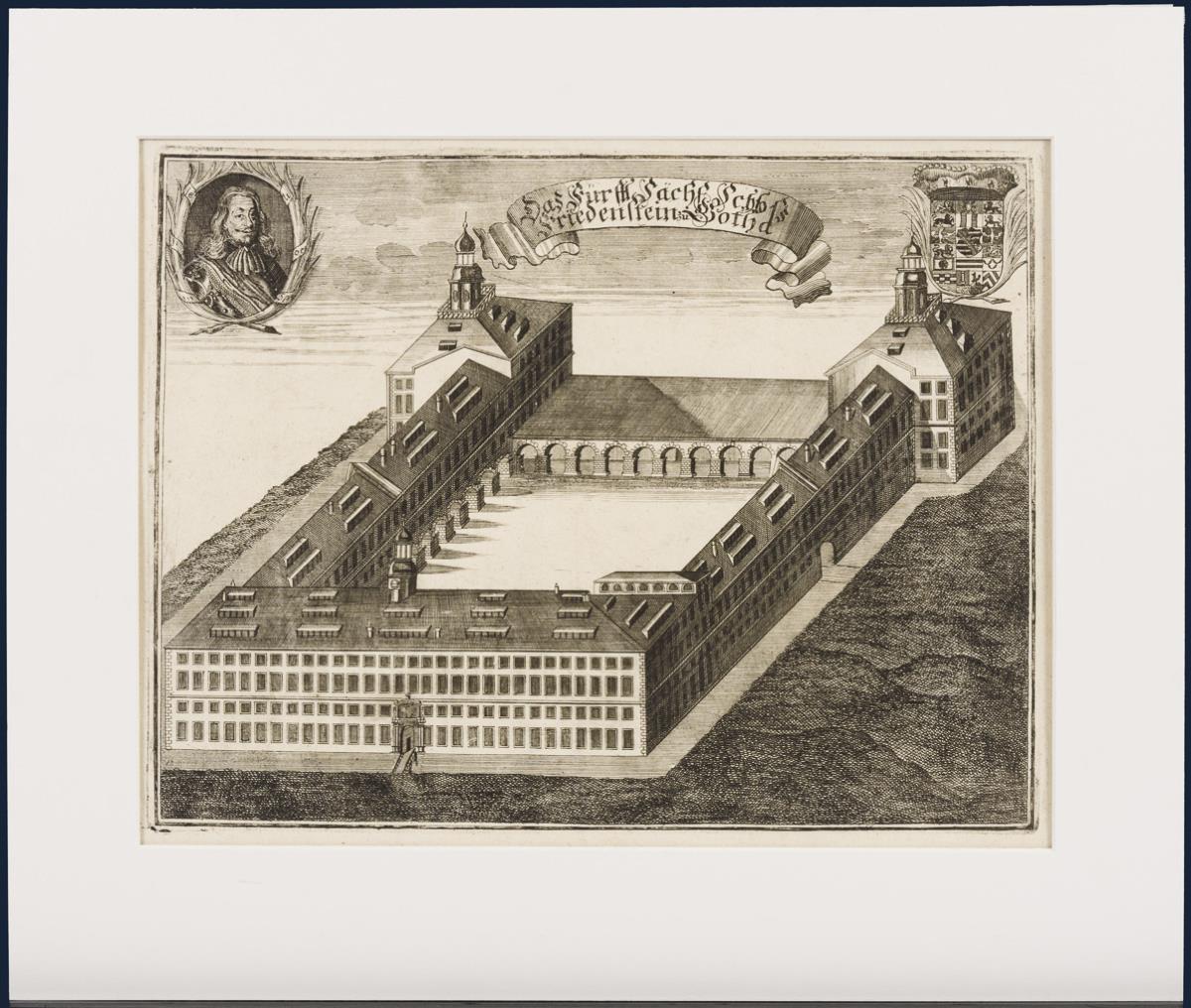 Darstellung des Schlosses aus der Vogelperspektive, bezeichnet "Das Fürstl. Sächs. Schloß Friedenstein zu Gotha", oben links eine Kartusche mit einem Porträt des Herzoges Ernst I. von Sachsen-Gotha (gen. Ernst der Fromme, 1601 - 1675), der zwischen 1643 und 1654 das Schloss erbauen ließ, oben rechts eine Kartusche mit dem Wappen des 1672 gegründeten Herzogtums Sachsen-Gotha-Altenburg. Senkrechter Knick, unten mittig auf Karton montiert.