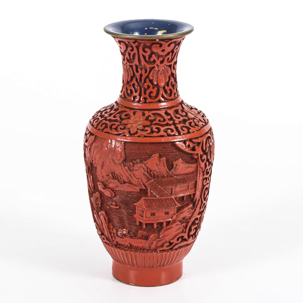 Vase mit Messingkorpus, darüber tiefer Lackschnitt. Zwei Bildkartuschen mit Stelzenhäusern an einem Bergsee. / Flache Dose mit einer geöffneten Blüte als Flachrelief auf dem Deckel. Matter Rotlack, schwarz abgesetzt.