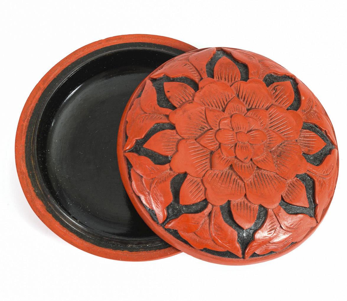 Rotlackvase und Rotlackdose mit Blüte.