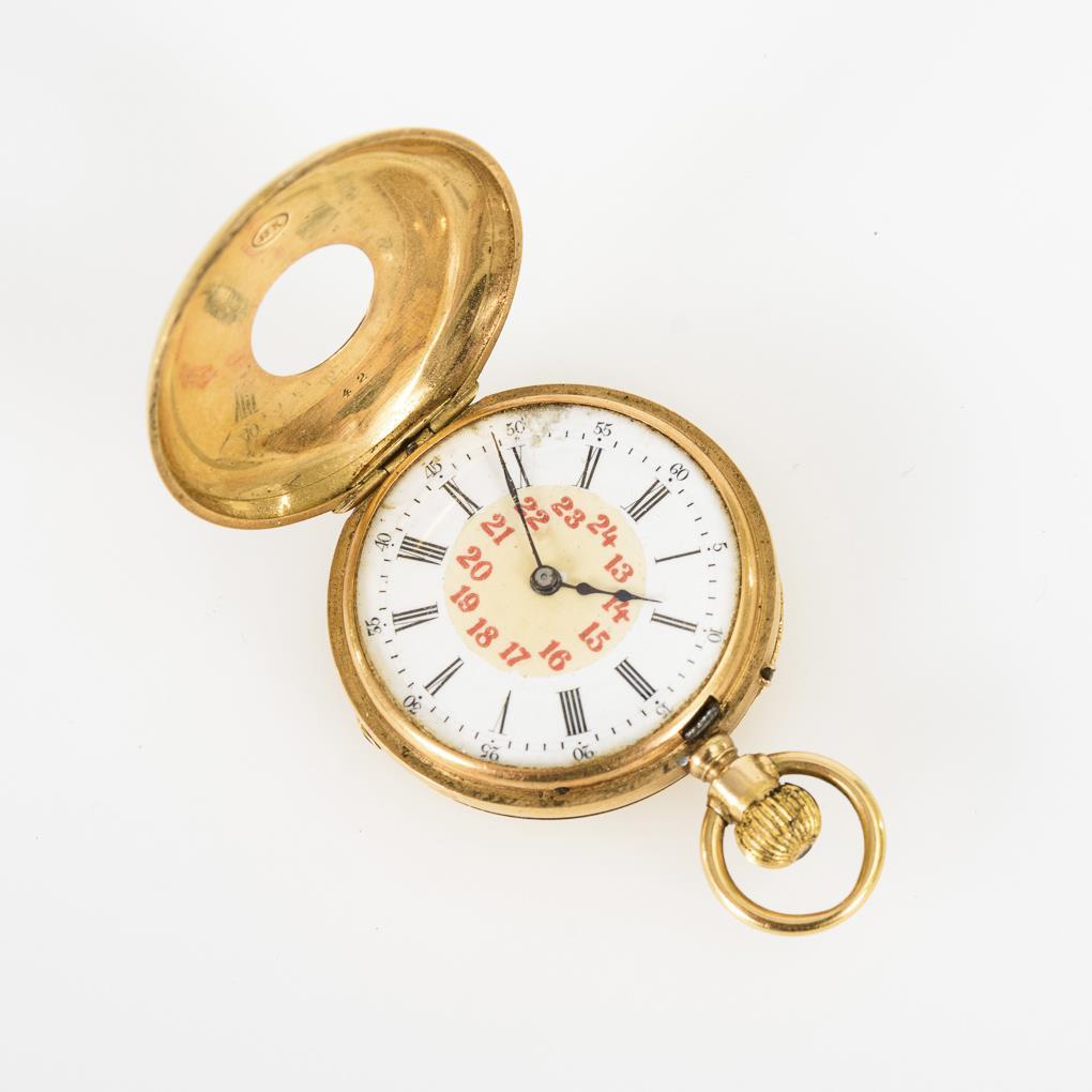 Ungemarktes Werk mit Zylinderhemmung und Kronenaufzug. Läuft. Weißes Emailzifferblatt mit römischen und arabischen Zahlen, Zentrum mit farbigem Hilfszifferblatt für 24 Stunden, umlaufende Minuterie, Spade-Zeiger.