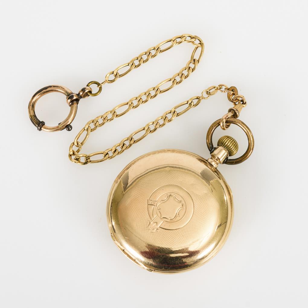 Ziseliertes und guillochiertes Gehäuse mit leerer Wappenreserve, Staubdeckel mit Widmung "Ihrem treuen Mitarbeiter, die Firma J. D. Rauert 1863/1888". Dazu eine 750 GG gepunzte Gliederkette mit ergänztem Doublé-Karabiner und Federring, L 25,5 cm. Leicht berieben und am Rand leicht gedellt, Zifferblatt haarrissig.