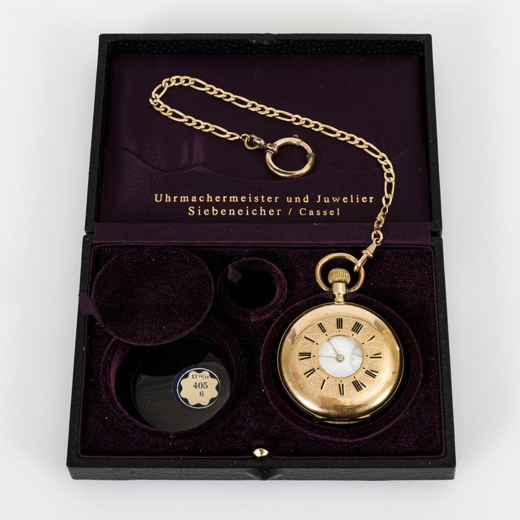 In schwarzem Etui "Uhrmachermeister und Juwelier Siebeneicher Cassel" mit Ersatzglas.