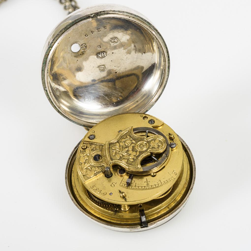 Schreitender Löwe/Stadtmarke Birmingham/Jahresbuchstabe Q (1864)/Firmenmarke BK (Benjamin Kirby) gepunzt. Ø 6 cm. Uhr 228 g, Kette 19 g.