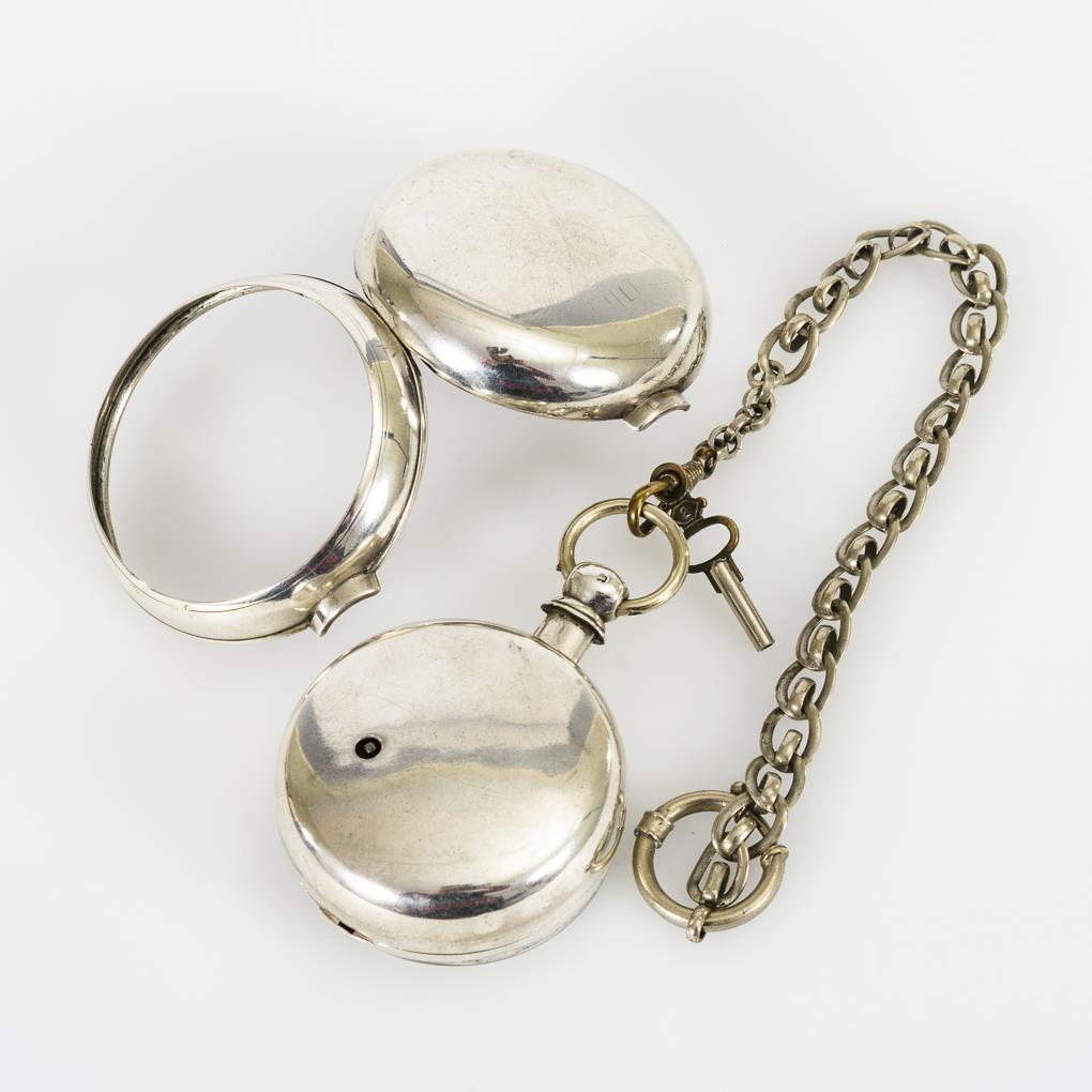 Große silberne Taschenuhr mit Uhrenkette.