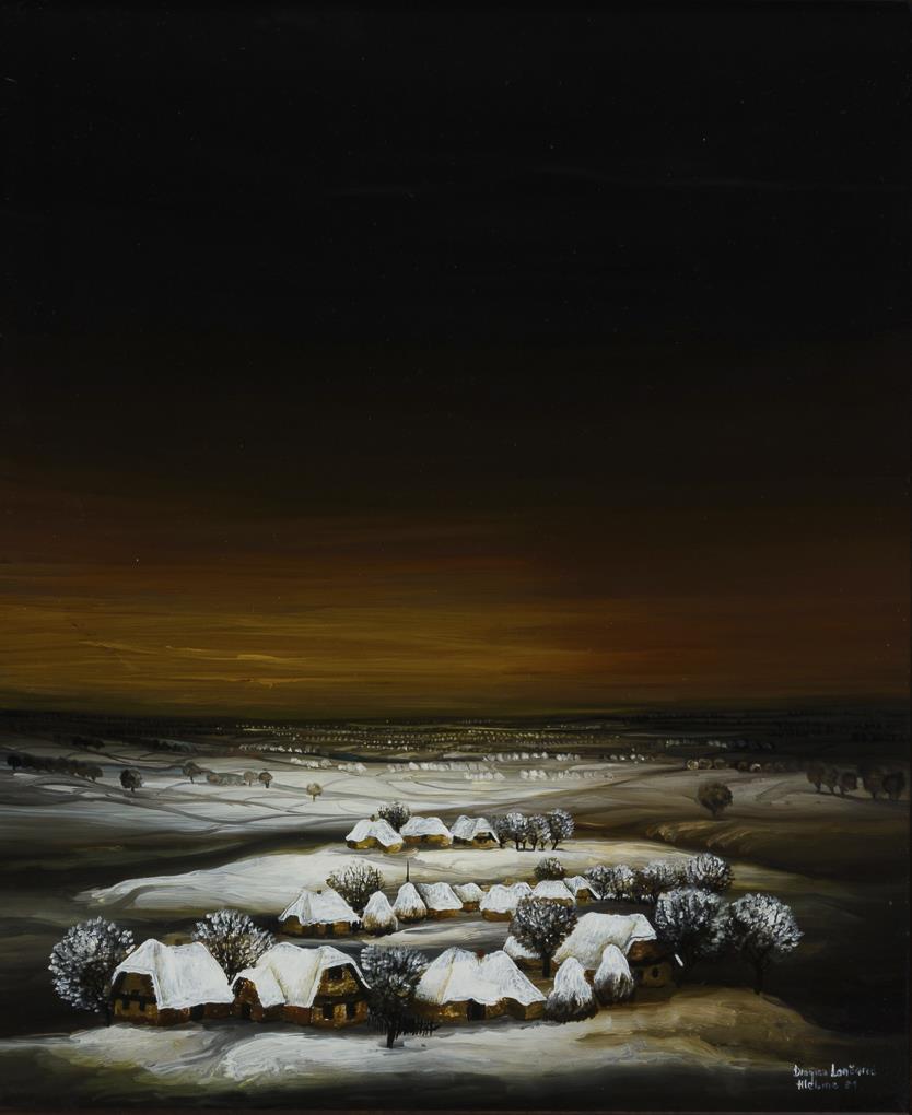 Weite verschneite Landschaft mit kleinem Dorf bei Sonnenuntergang.
