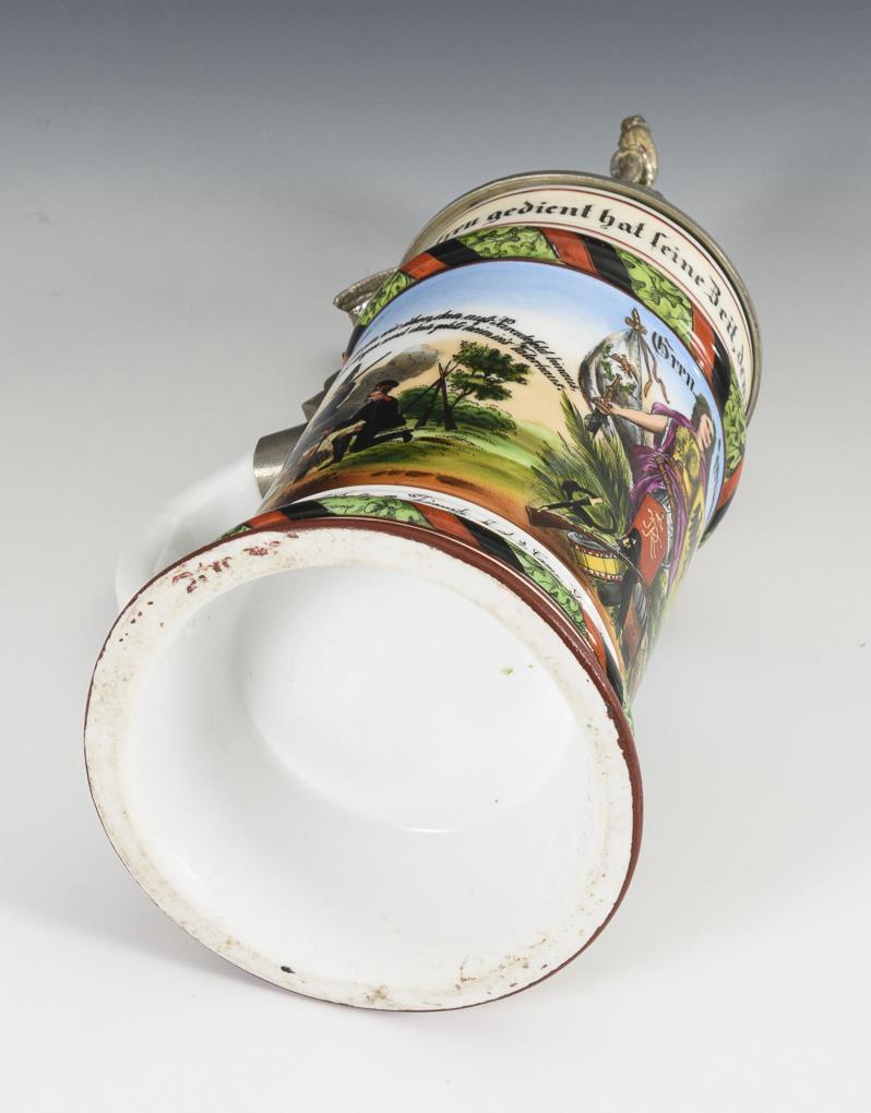 Porzellan mit Bodenlithophanie (Paar), polychrom bemalter Vordruck, Zinndeckel. H 27,5 cm.