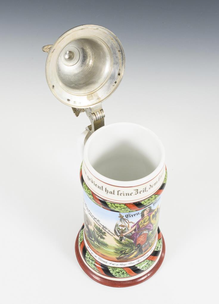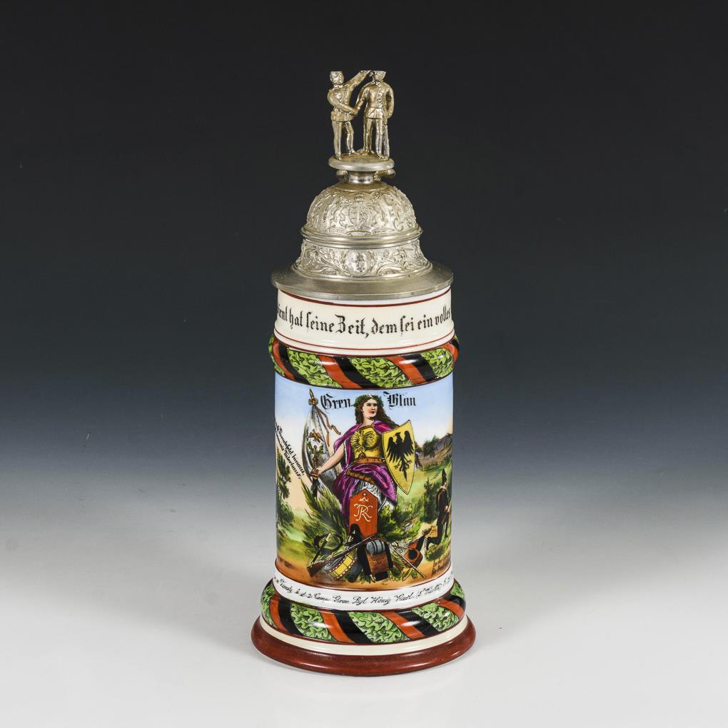"Gren. Glan" "2. Comp. Gren. Regt. König Karl (5. Württ.) No. 123 Ulm". Allegorie von Württemberg und Soldatenszenen mit Sinnsprüchen, Namensliste. Reliefierter Zinndeckel mit Vogeldrücker und Soldatengruppe als Bekrönung. Köpfe der Deckelfiguren beschädigt, unauffällige Haarrissspinne am Boden.