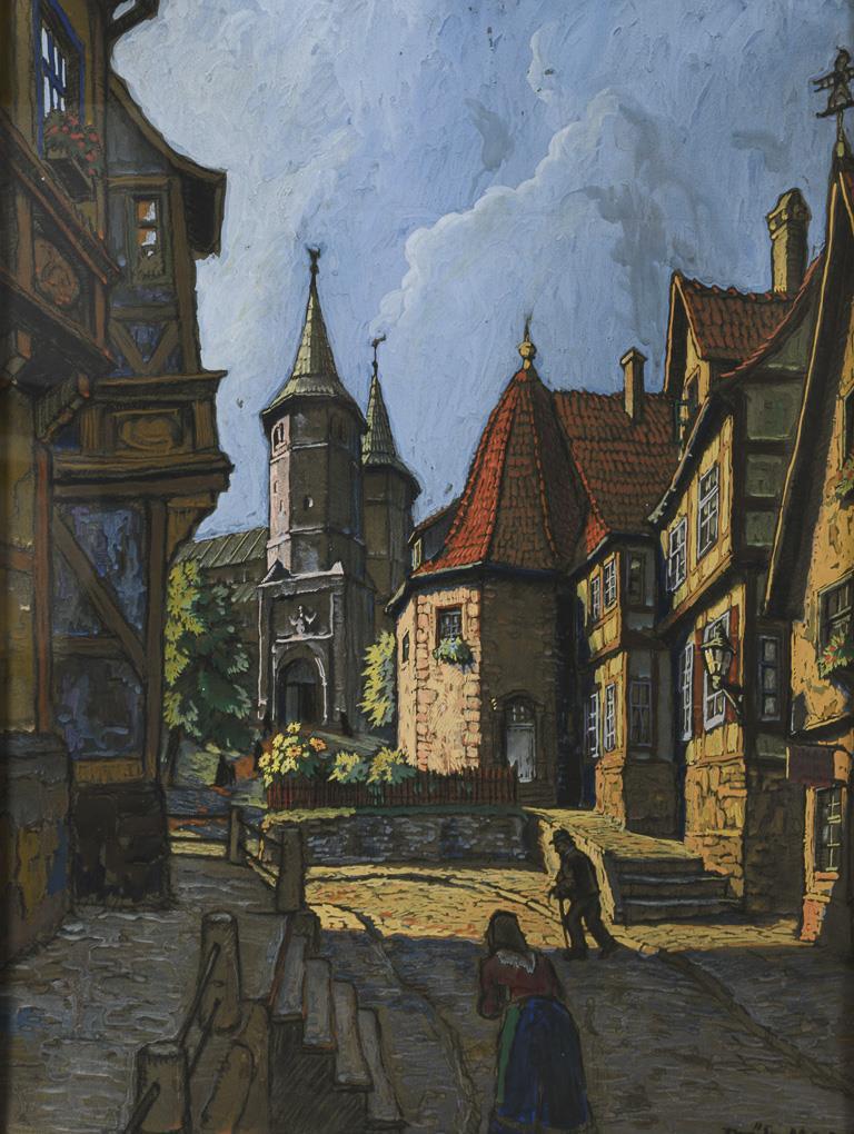 Staffagefiguren auf der Straße im Schatten der Fachwerkhäuser an einem sonnigen Morgen.