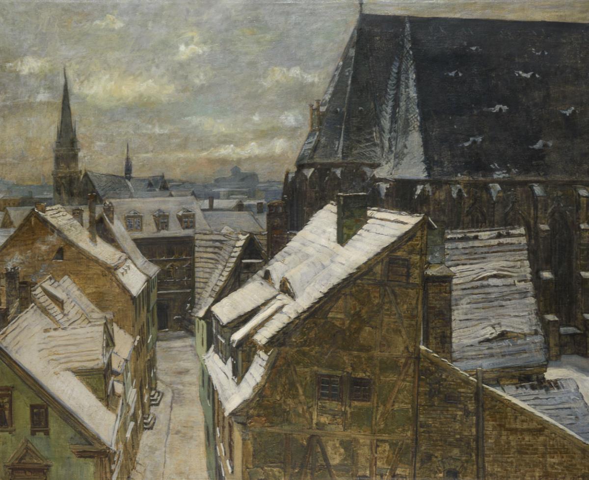 Blick über die Dächer der Stadt im Winter unter einem leicht bewölkten Himmel.