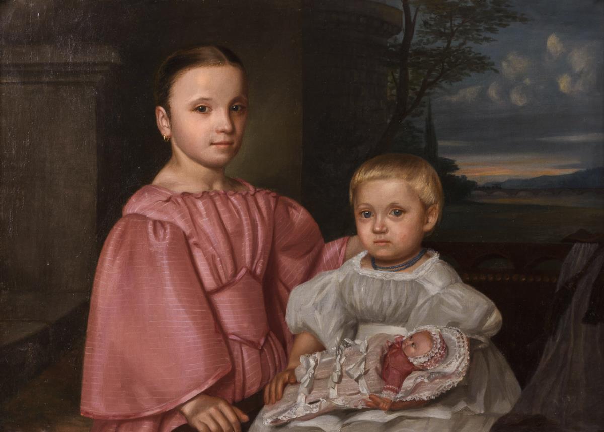 Porträt zweier Schwestern auf einem Balkon mit einer Babypuppe Sonneberger Täufling Motschmann Typ und Blick in die weite Landschaft zur fahrenden Eisenbahn auf der Brücke über der Elbe. Zwei kleine restaurierte Stellen mit Hinterklebungen.