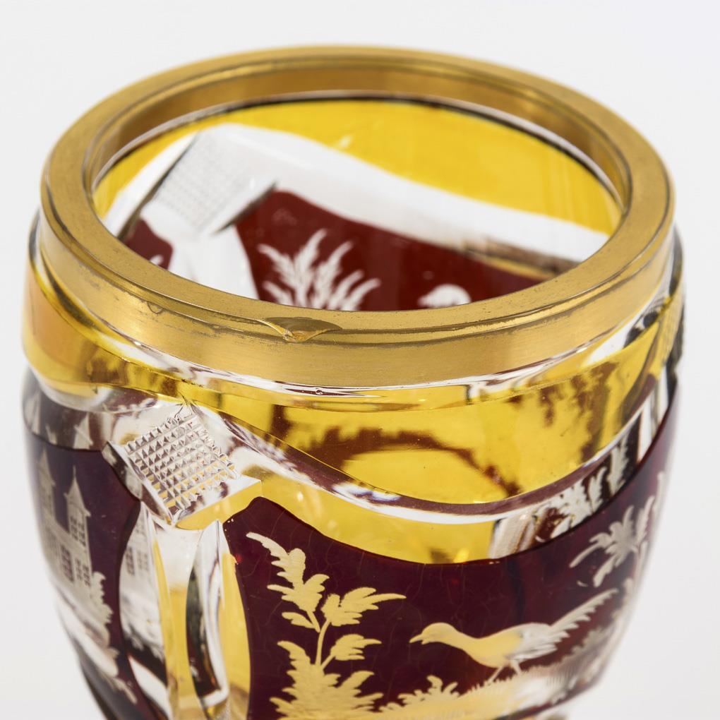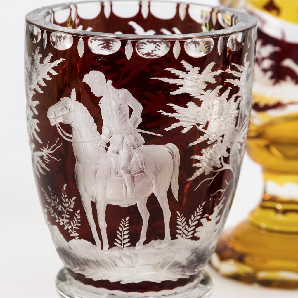 1x Pokal mit Rotbeize: umlaufend eine gravierte Landschaft mit Reiter. / 1x Pokal mit Gelb- und Rotbeize: mit drei gravierten Landschaftsdarstellungen mit Architektur bzw. Vögeln. / 1x Pokal mit Rotbeize: mit floraler Gravur. 1x mit Randbestoßung.