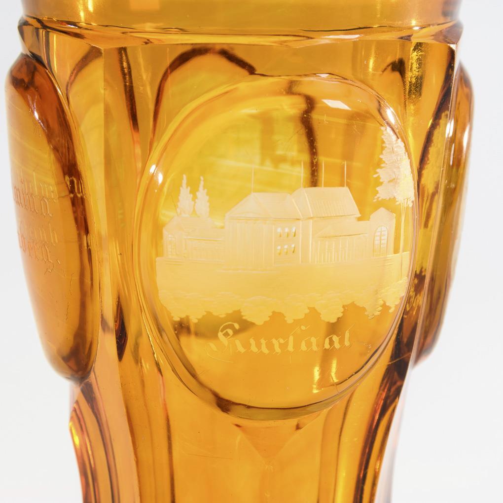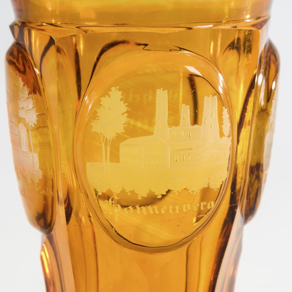 Farbloses, teils bernsteinfarben gebeiztes Glas, graviert. H 12 und 13,5 cm.