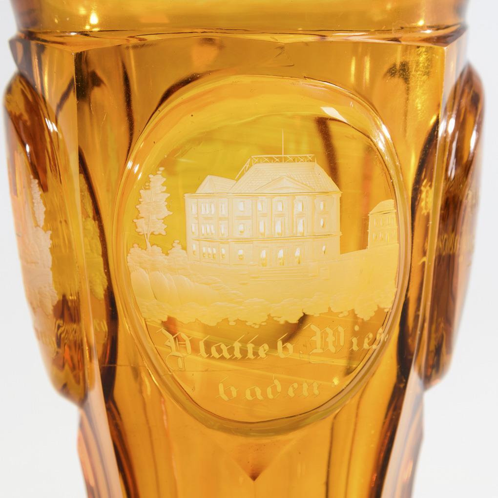 1x facettierter Becher mit drei Ansichten von Wiesbaden sowie dem Namen "Wilhelmina Steinberg". / 1x am Ansatz facettierter Becher mit einer Ansicht von Salzbrunn. 1x kleine Bestoßungen am Stand.