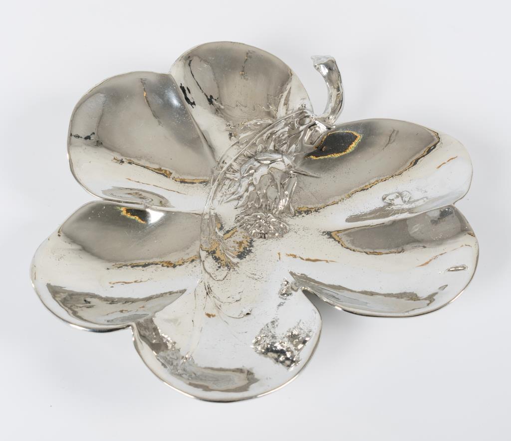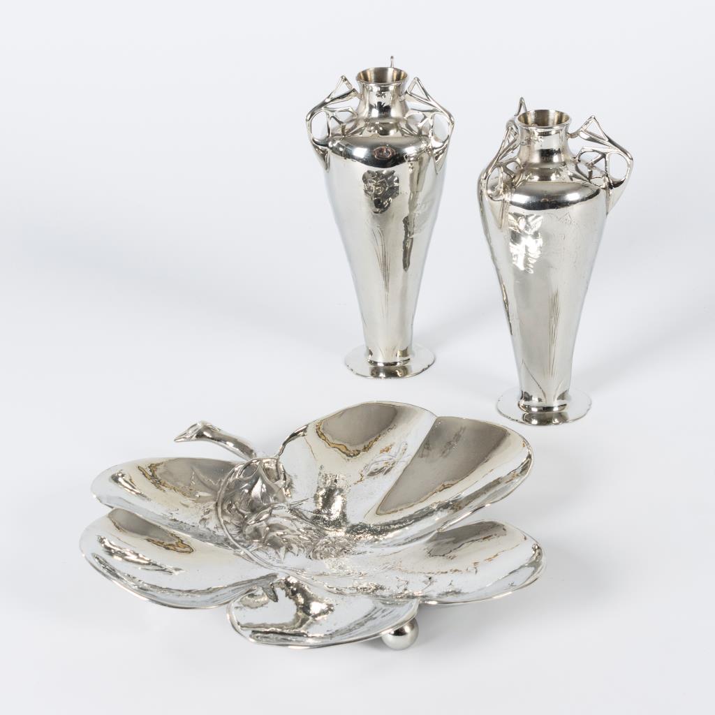 Jugendstil-Blattschale und Vasenpaar Silberzinn