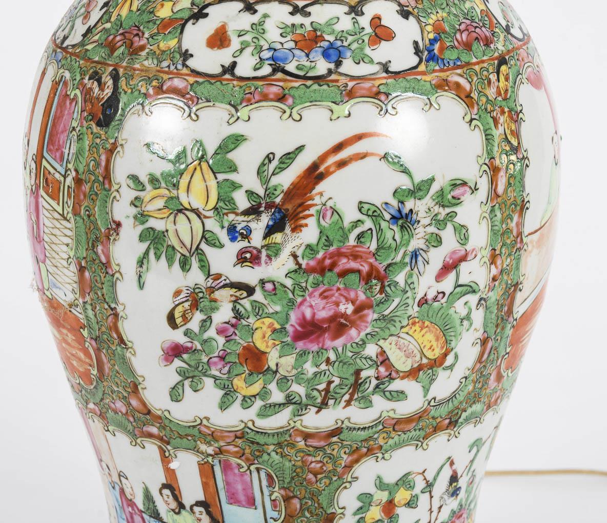 Balusterform mit Personen- und Blumendarstellung in verschieden großen Bildkartuschen. Vase mit Holzsockel und defekter Elektrik. Alters- und Gebrauchsspuren.