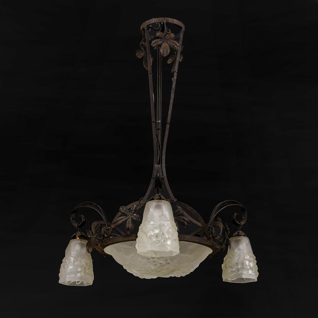3 + 1-flammige Hängelampe mit 3-strebig gebündeltem Metallgestell und Blütendekor, 3 geschweiften Metallarmen mit Tulpenschirmen und zentraler, formgepresster Glasschale. Alters-/Gebrauchsspuren.