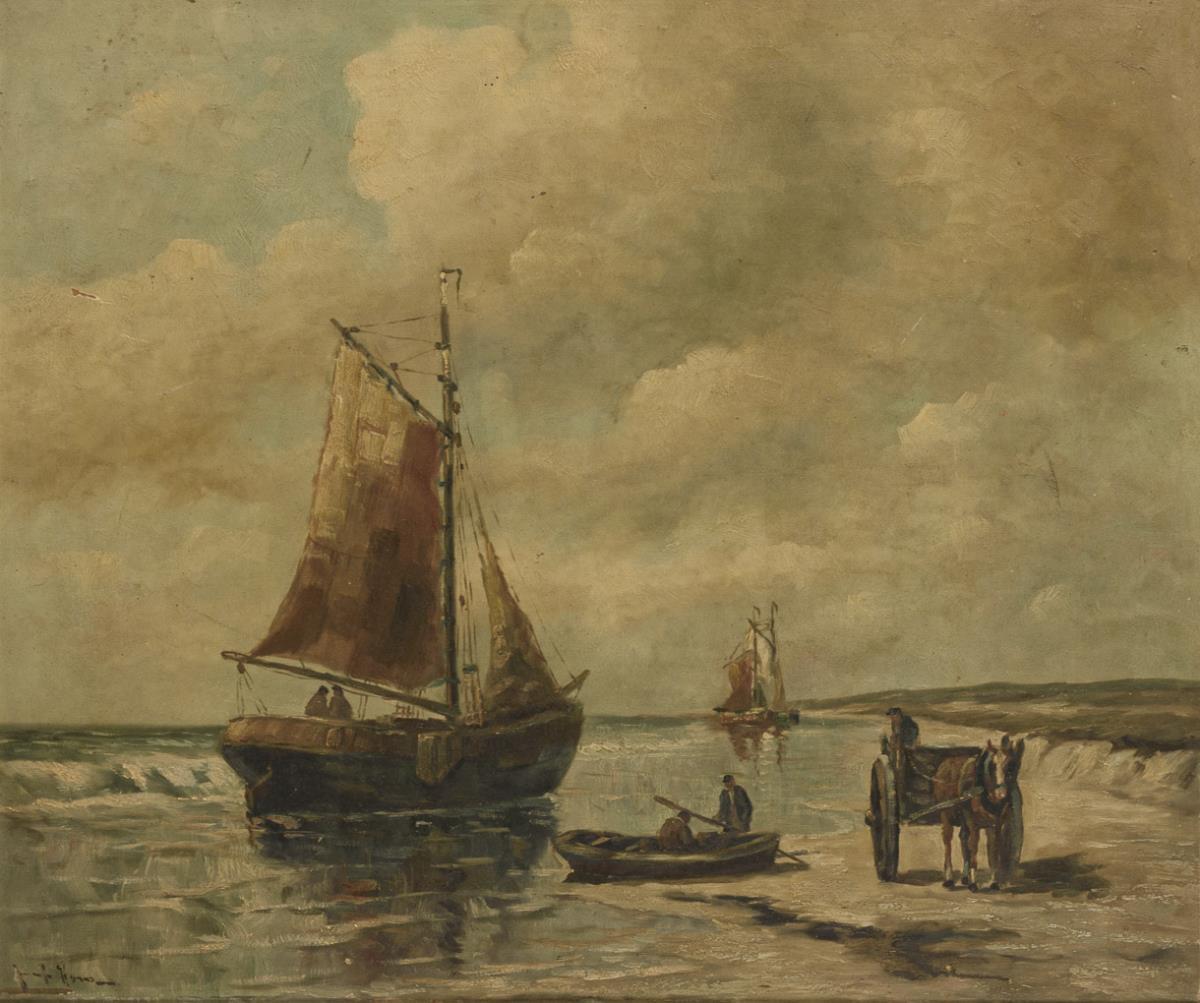 Fischer am Strand beim Entladen des Fanges im Sonnenschein. Minimale Altersspuren.