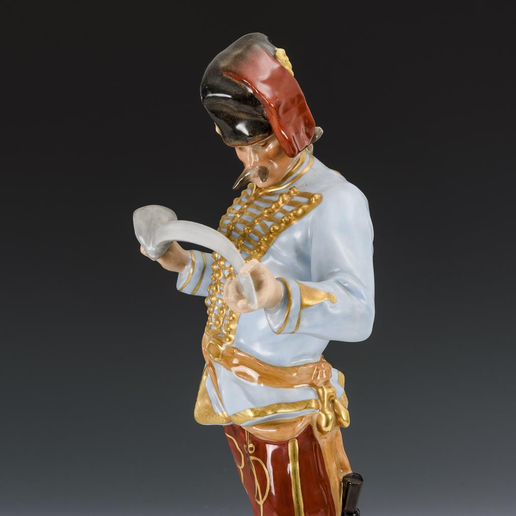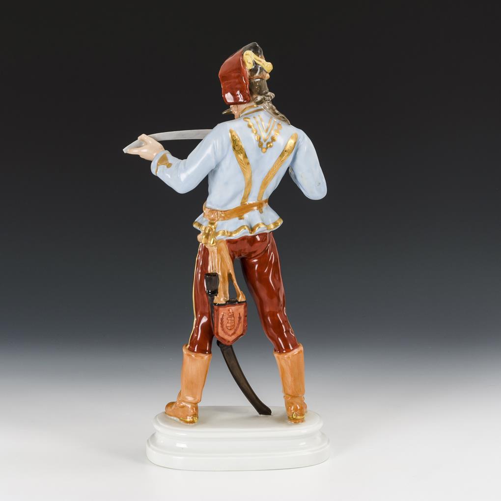 Die Schneide seines Säbels prüfender ungarischer Soldat. Säbelspitze bestoßen.