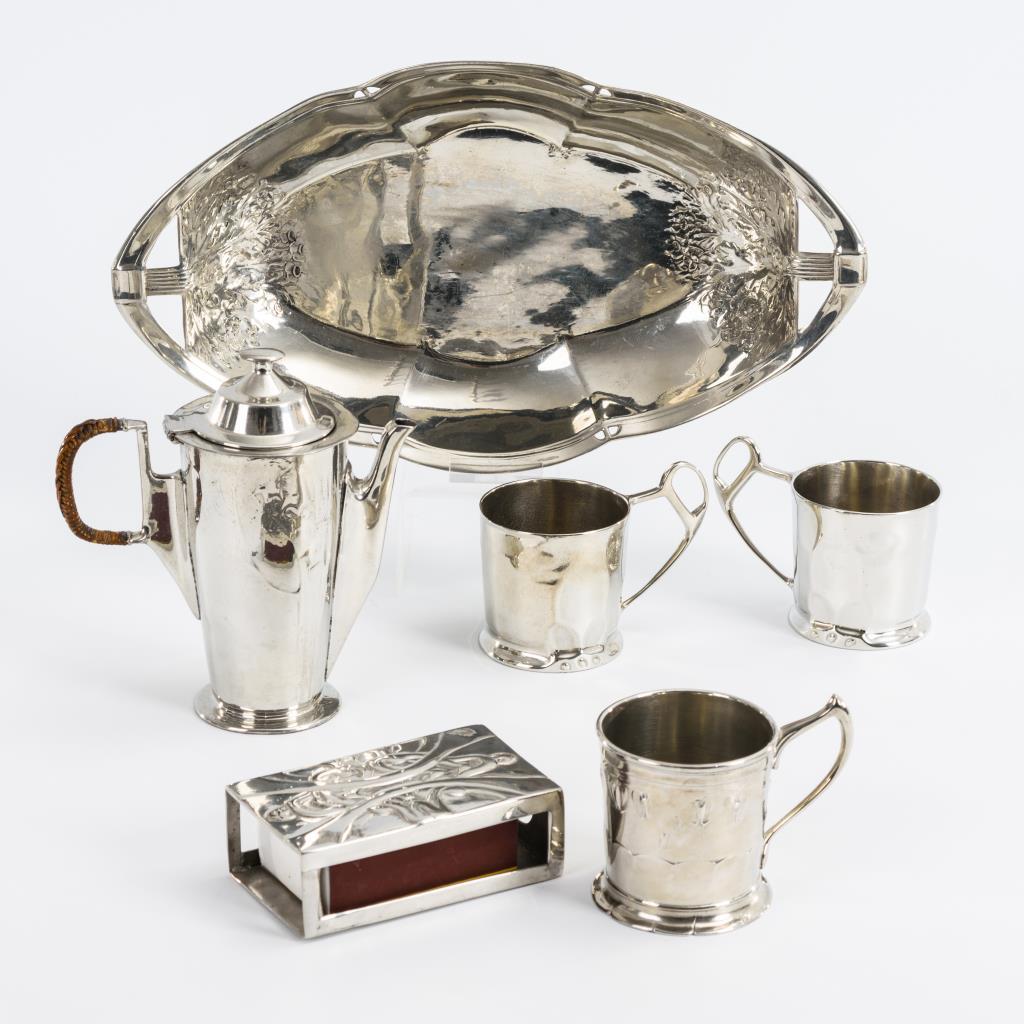 Undeutlich gemarkte Brotschale, HB gemarkte Fidibushülle, Kayserzinn-Kännchen und 3 -Teeglashalter, darunter 2 gleiche. Minimale Alters-/Gebrauchsspuren an der Schale.