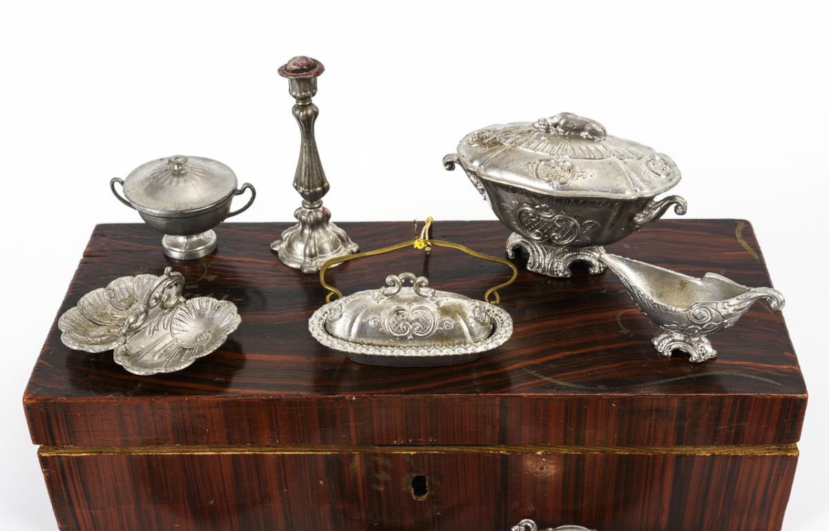 26 Teile Zinn für die Puppenstube, darunter Teller, Schalen, Saucieren und ovale Terrine. Dazu 16 Teile passendes Miniaturbesteck. In Kästchen mit mahagonifarbener Bierlasur. Bespielt, mit Altersspuren.