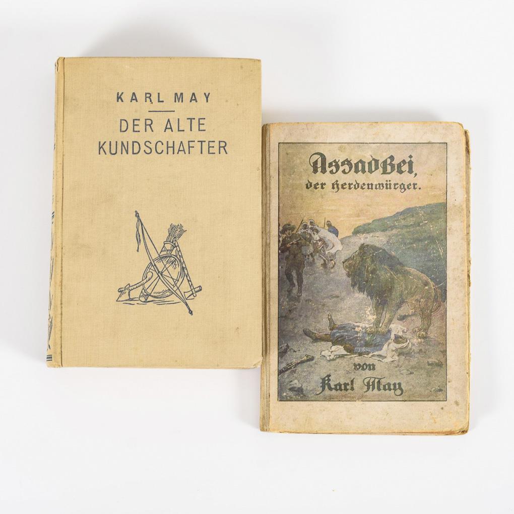 "Der alte Kundschafter", Grethlein & Co. sowie Carl Schünemann Verlag, 1931. 325 Seiten, im Leineneinband. Leichte Gebrauchsspuren. / "Assad Bei der Herdenwürger", A. Weichert Verlag, Berlin, 62 Seiten und 2 Abbildungen. Halbleineneinband, im Vorsatz Tintenflecke und Widmung, Gebrauchsspuren .