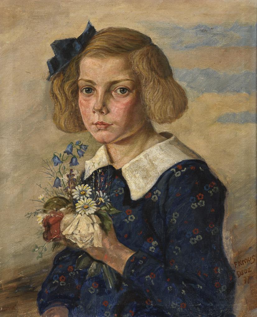 Porträt eines Mädchens im blauen Kleid mit blondem Haar und Wiesenstrauß in der Hand. Eine sehr kleine restaurierte Stelle.