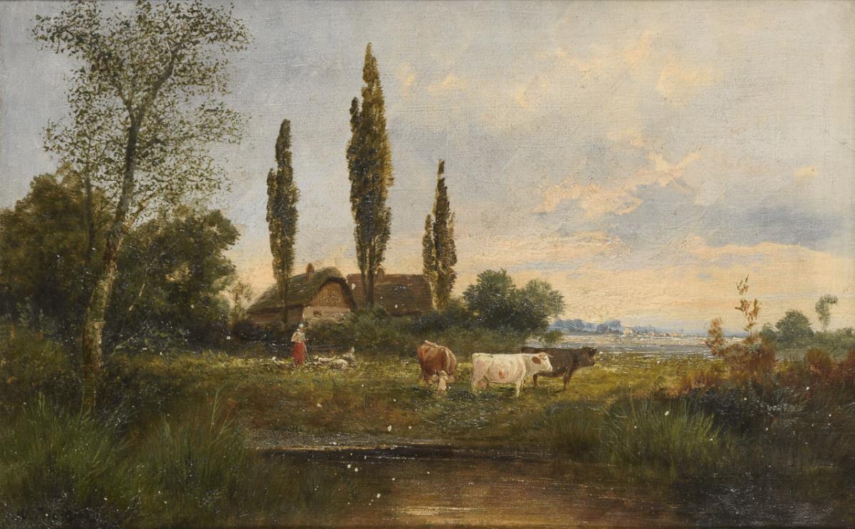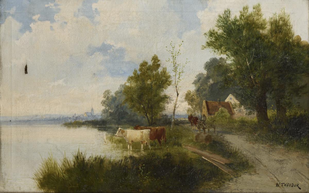 Flusslandschaft mit Rindern am Ufer nahe der Stadt sowie Magd mit Rindern nahe dem Bauernhaus am Abend. Ein Defekt.