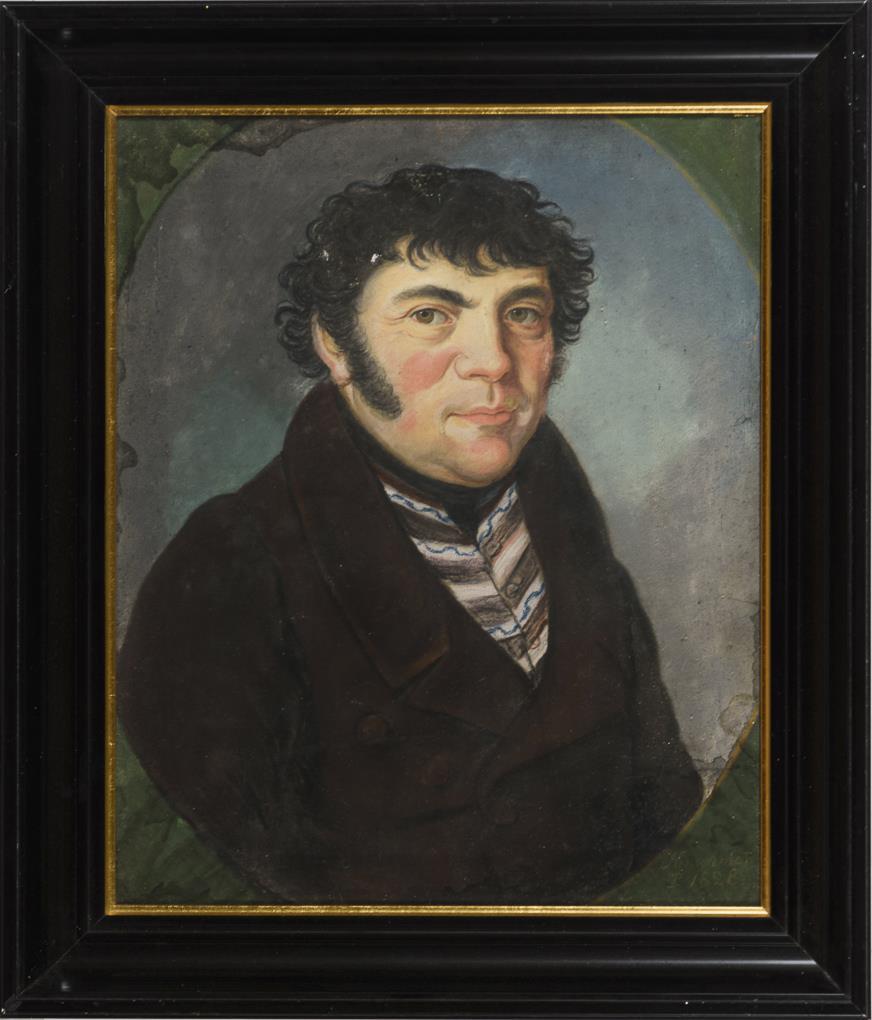 Porträt eines Mannes mit lockigem Haar und im braunen Gehrock. Wasserschaden an den Rändern.