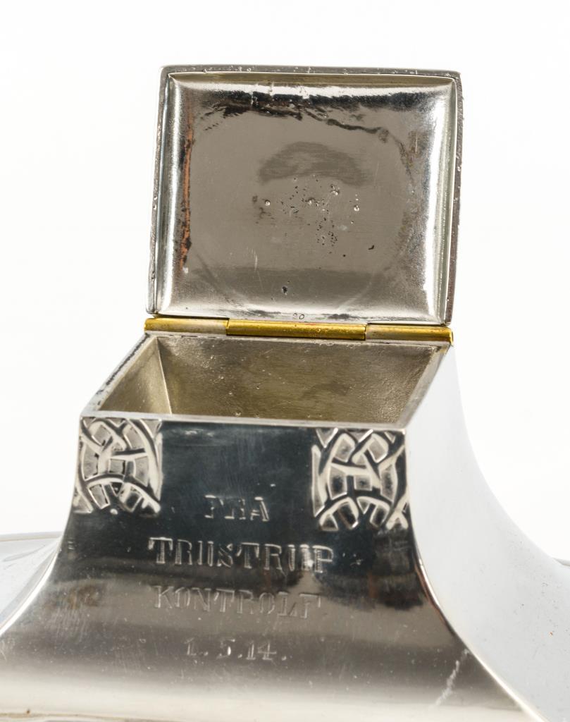 WMF Schreibzeug mit integriertem Tintenfass (Einsatz fehlt) sowie Gravur mit Datum 1914 .