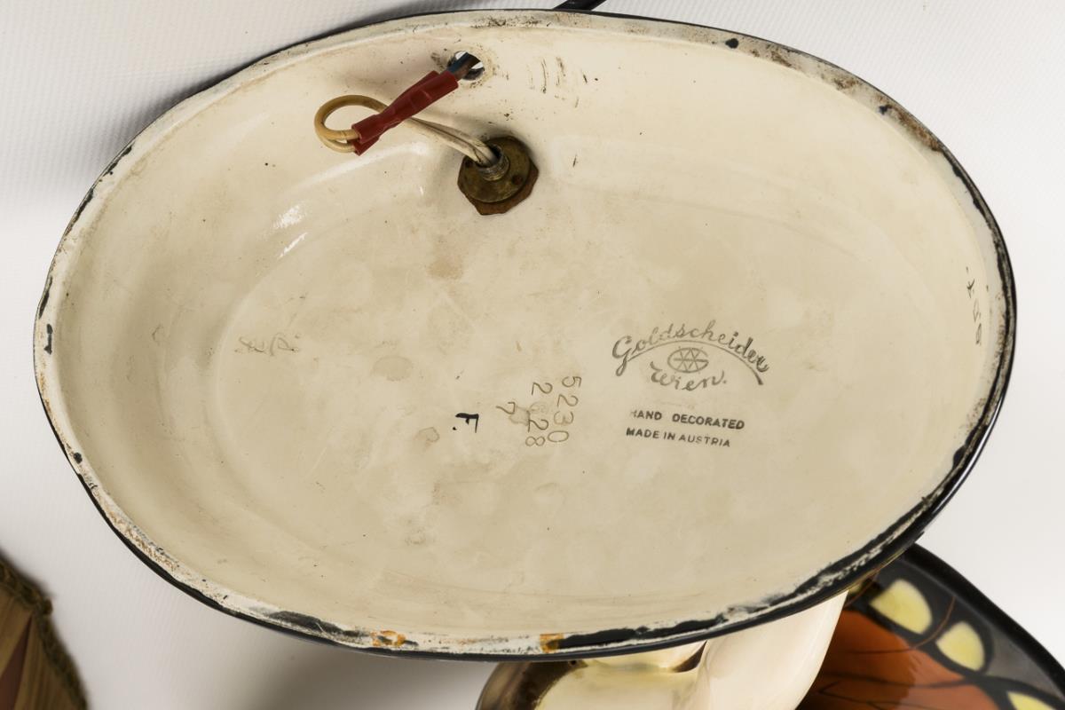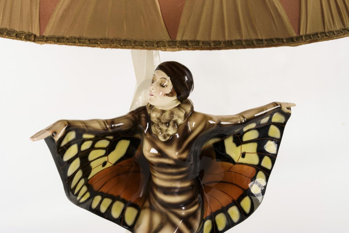 Fayence-Plastik mit Darstellung eines faunalen Ausdruckstanzes nach dem berühmten Vorbild der deutschen Tänzerin Niddy Impekoven, auf schwarzem Ovalsockel. Wohl originaler Schirm mit brauner Stoffbespannung. Neu elektrifiziert. Schaft, rechter Arm und rechter Flügel restauriert.