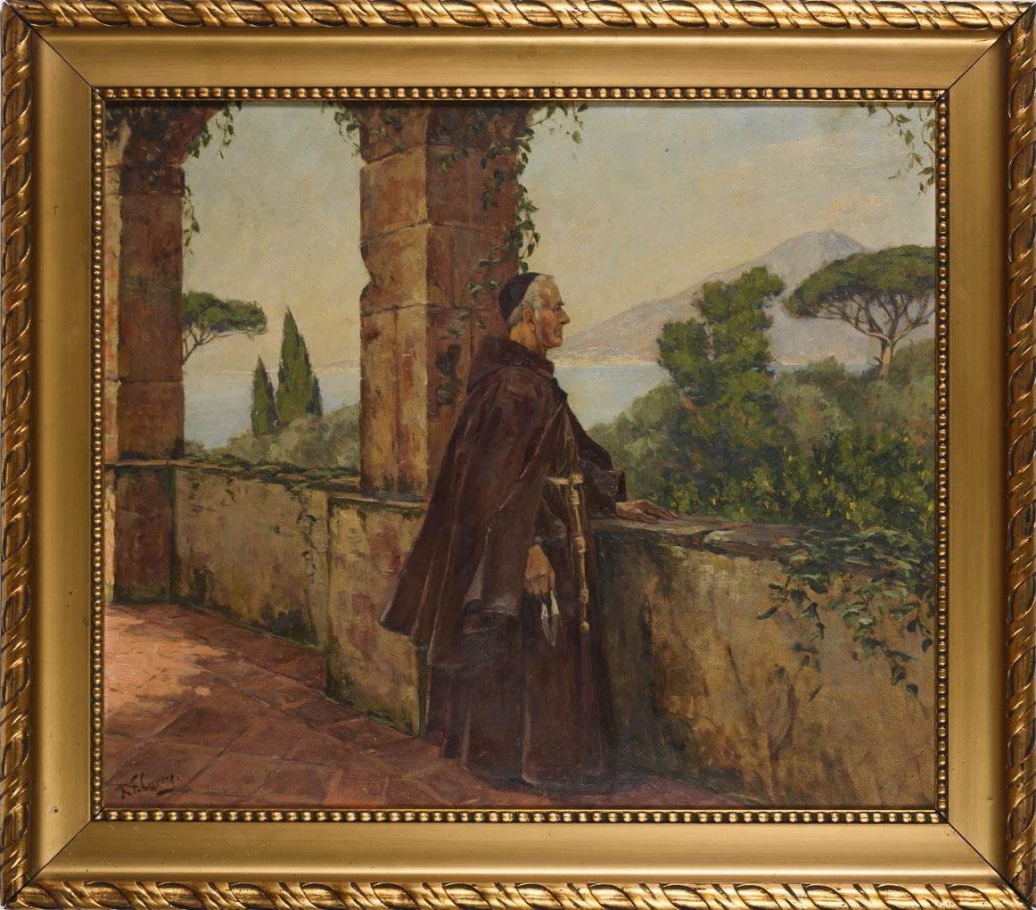 Älterer Mönch mit nachdenklichem Blick in Richtung der Bucht von Neapel mit dem Vesuv am Horizont.