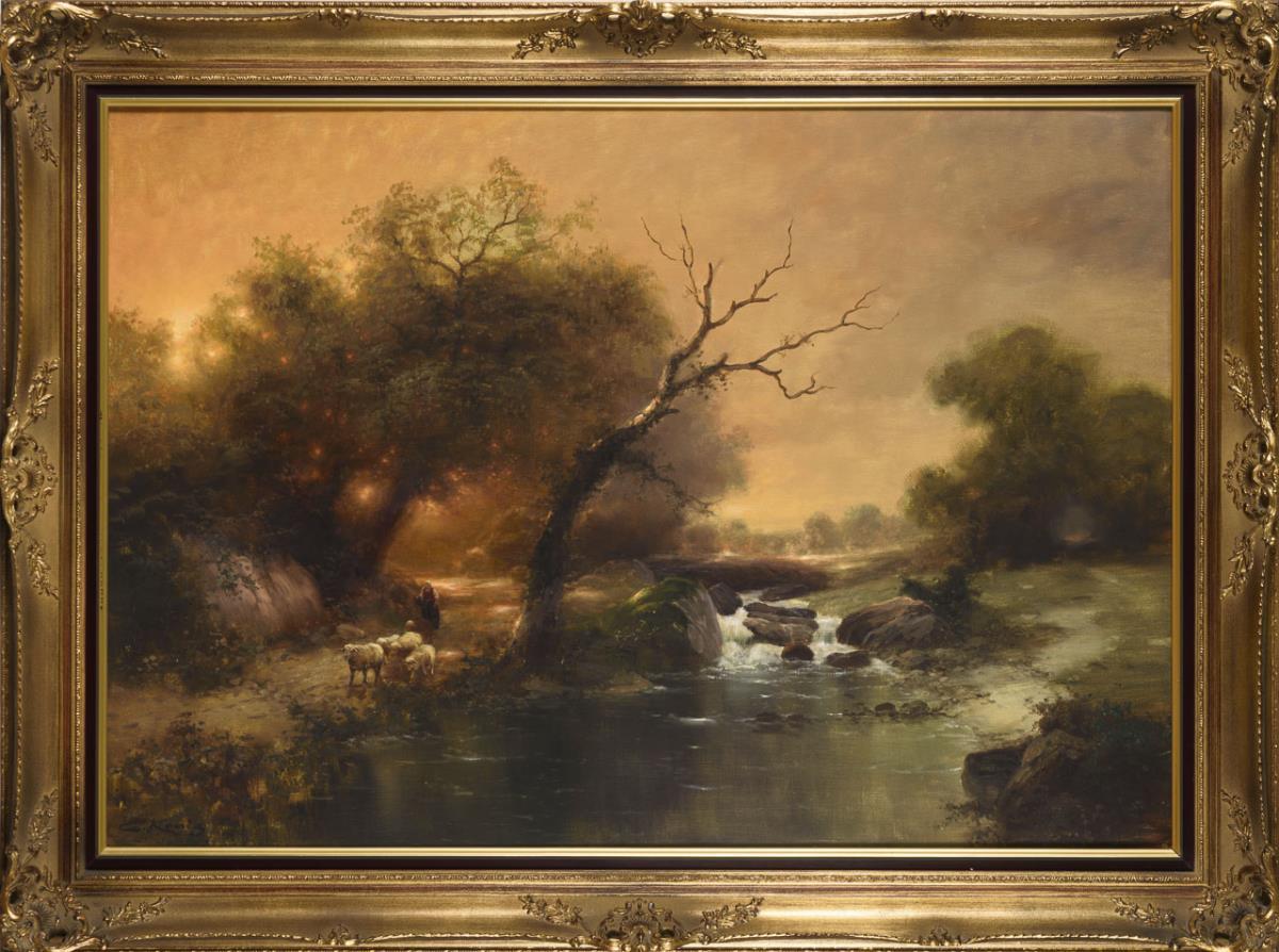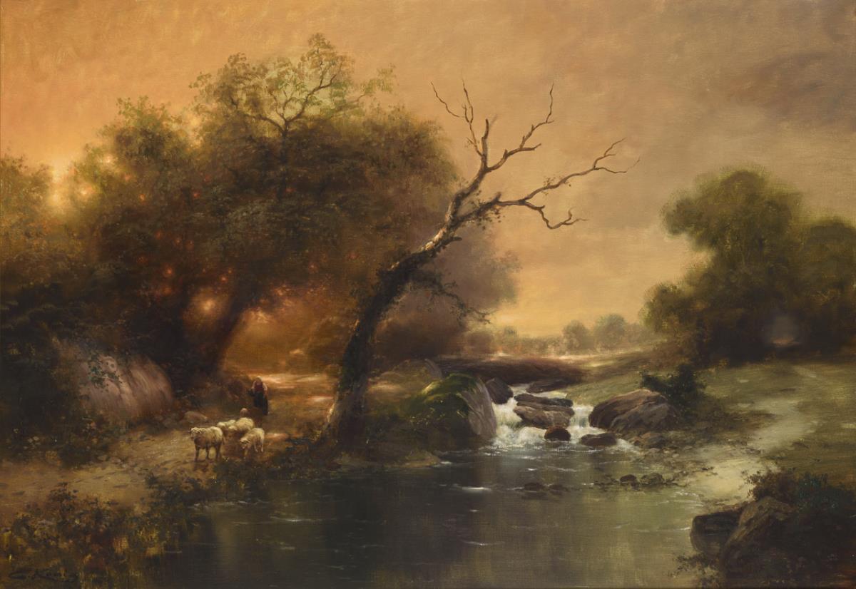 Die Bäuerin mit den Tieren auf einem Weg am Fluss in idyllischem Licht.