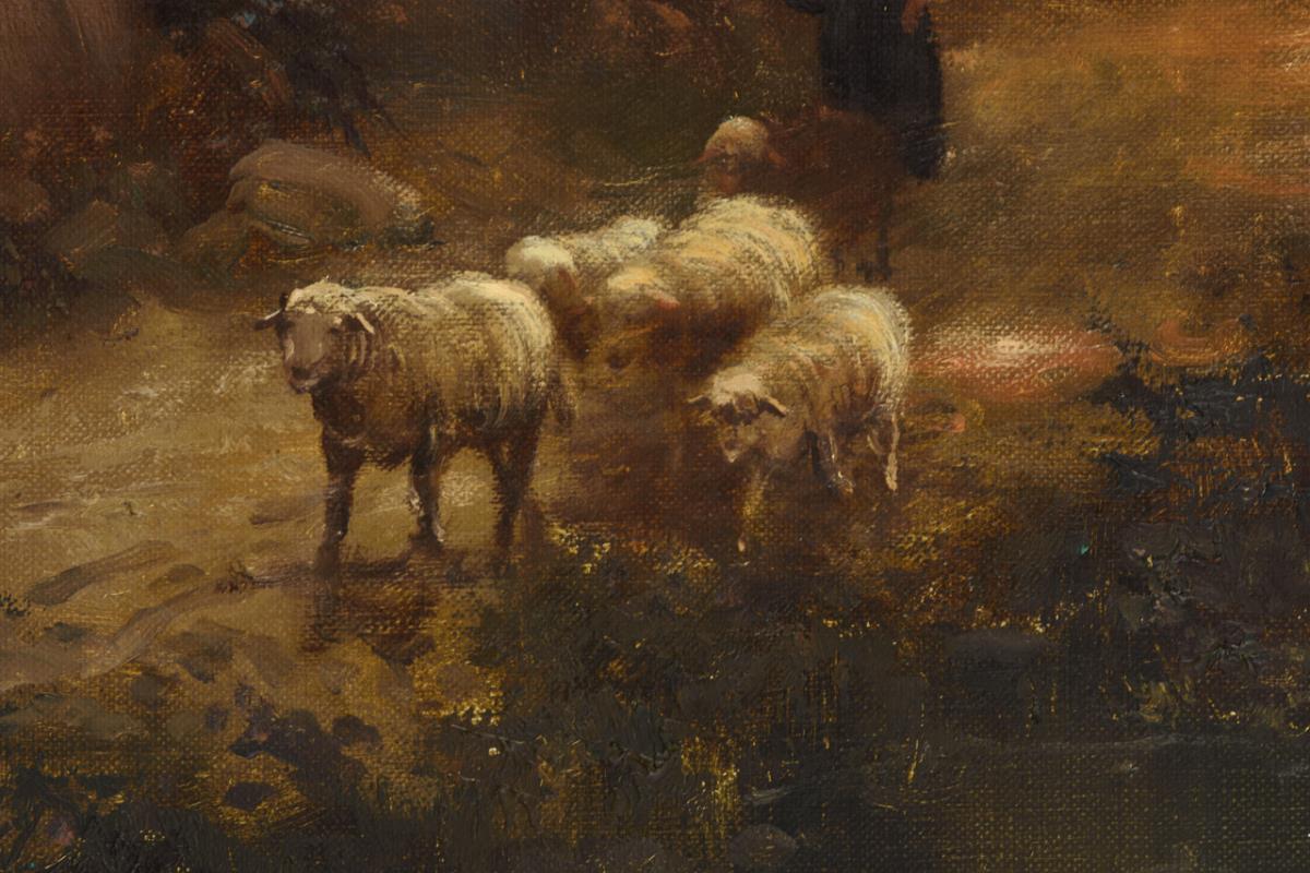 Schafe und Hirtin im Abendlicht