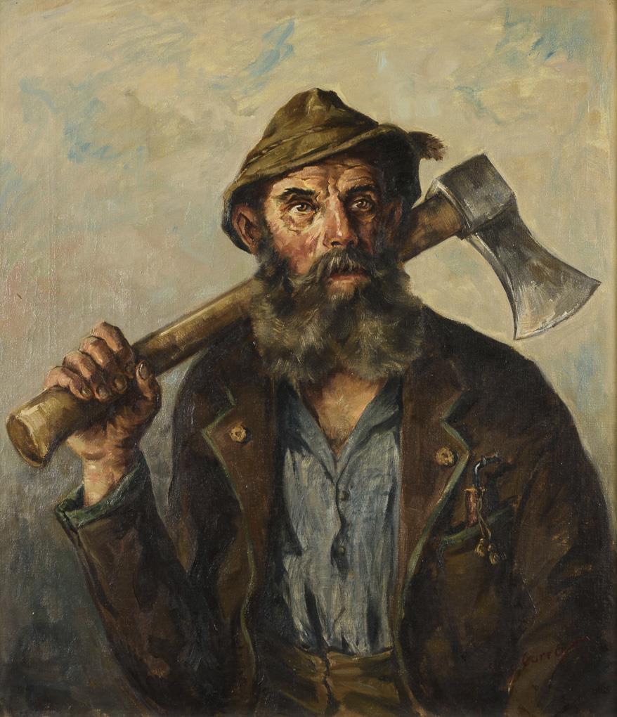 Porträt des Mannes mit dichtem Bart und der geschulterten Axt.
