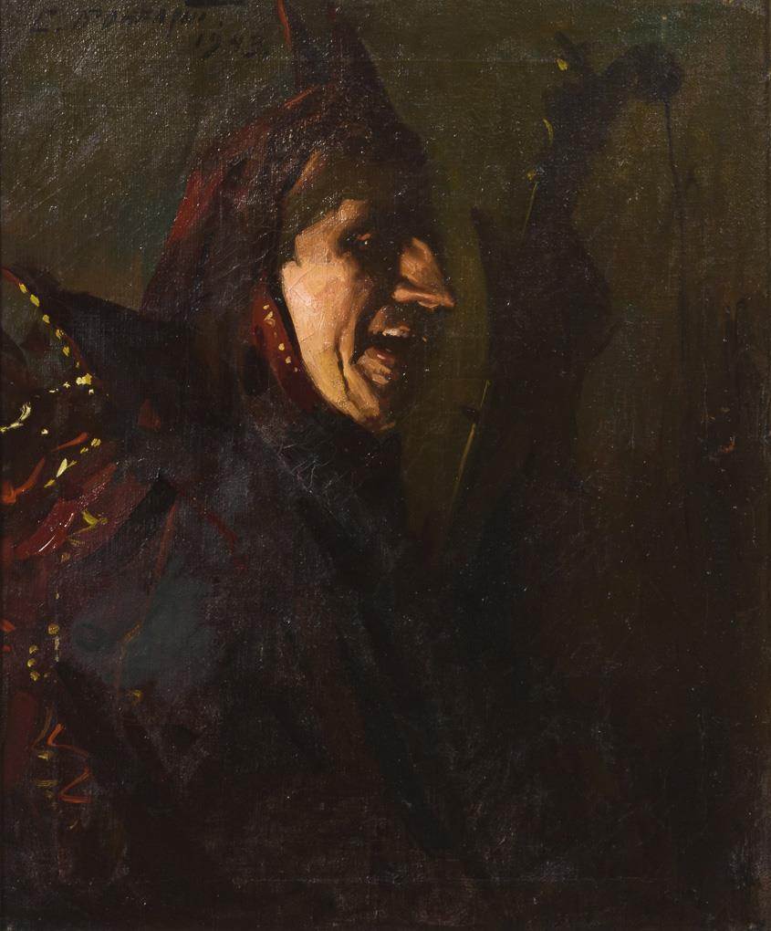 Singender Harlekin mit Laute in teils hellem Schlaglicht. Eine restaurierte Stelle mit Hinterklebung.