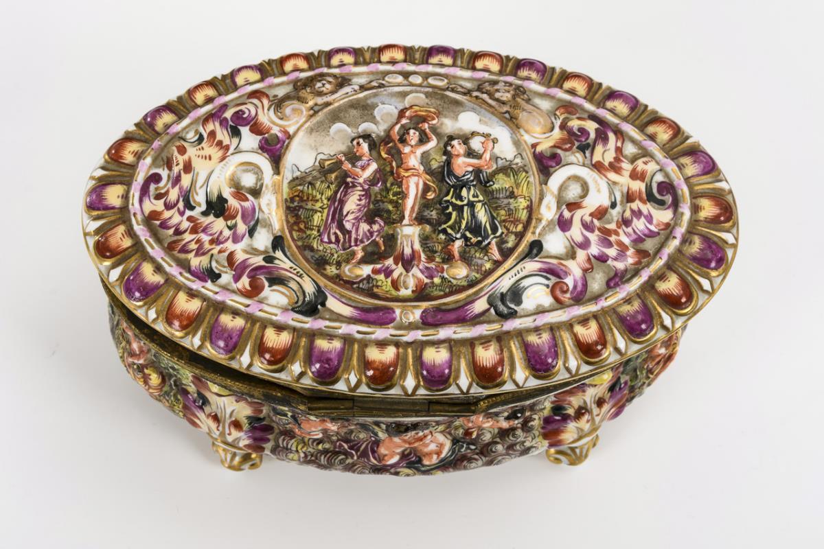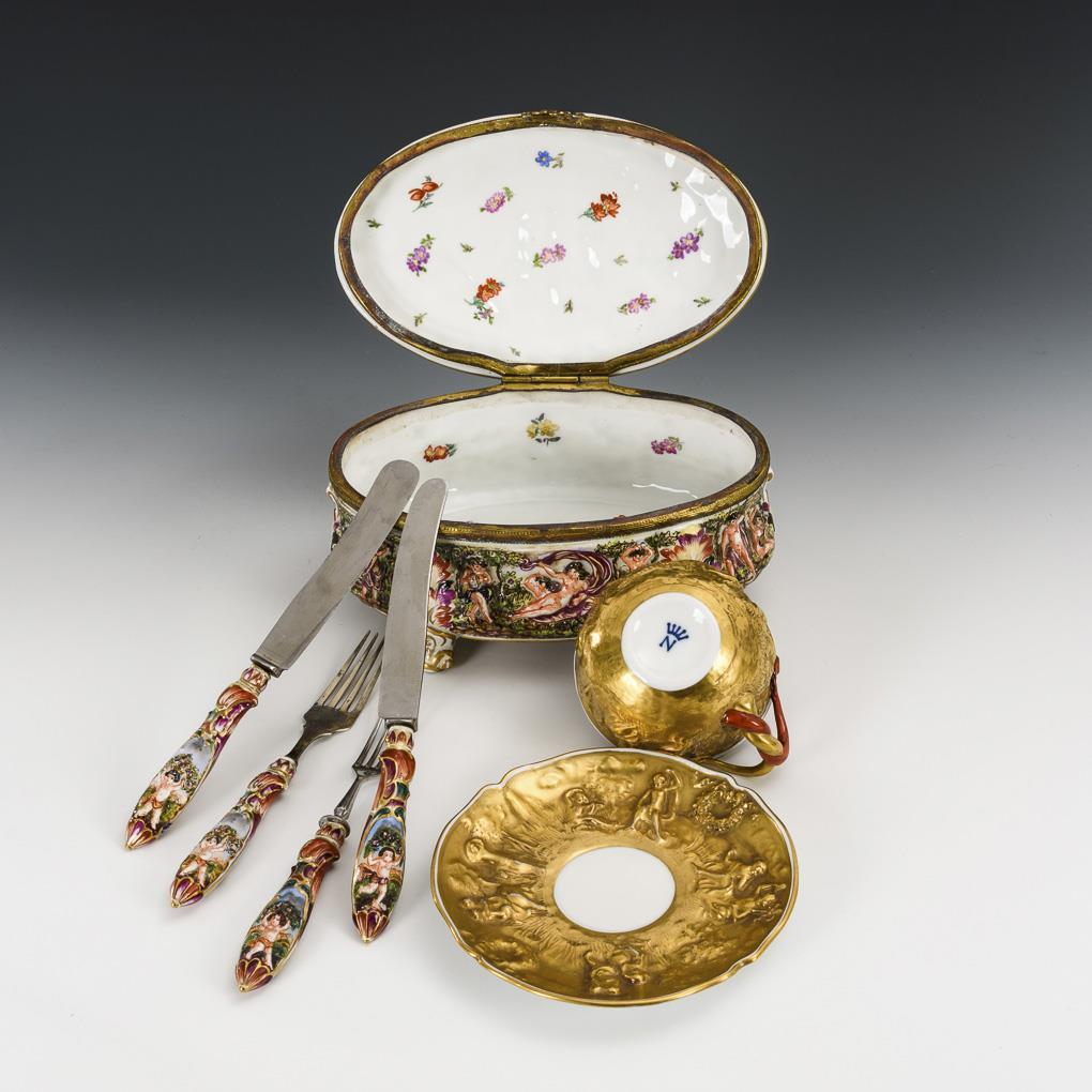 Alle mit mythologischen Reliefszenen. Ovale Dose mit vier Füßen und messingmontiertem Scharnierdeckel (H 11 cm, L 21,5 cm). / Tasse (H 6,5 cm) und Untertasse (Ø 16 cm) mit Reliefszenen und Ätzgoldfond. / 2 Messer und 2 Gabeln (L 19 und 21,5 cm). 1 Gabel und Messerklingen ergänzt, 1 Blatt am Tassenhenkel bestoßen.