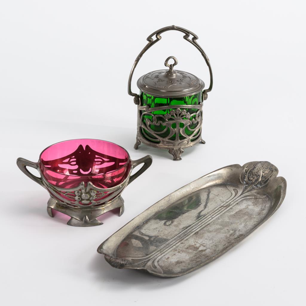 3x Jugendstil-Zinn: Tablett, Schale und Dose