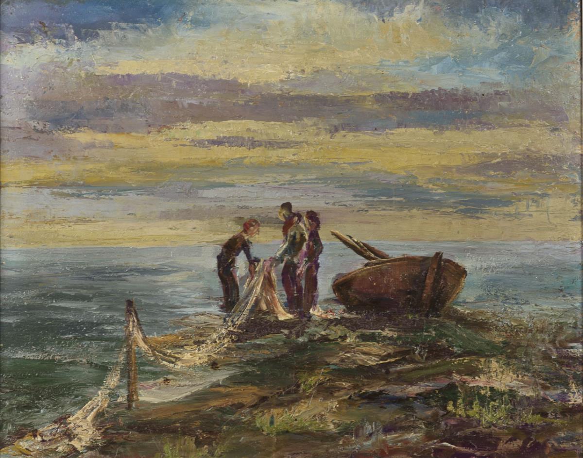 Fischerboote nahe der Küste bzw. Fischer am Ufer beim Ausbreiten der Netze.