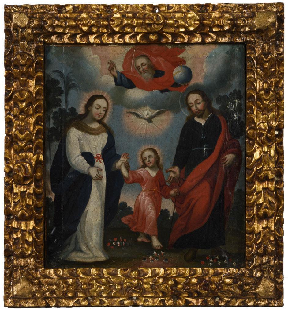 Jesus, Maria und wohl der Johannesknabe in einer Landschaft , darüber Gottvater und der Heilige Geist. Leichte Altersspuren.
