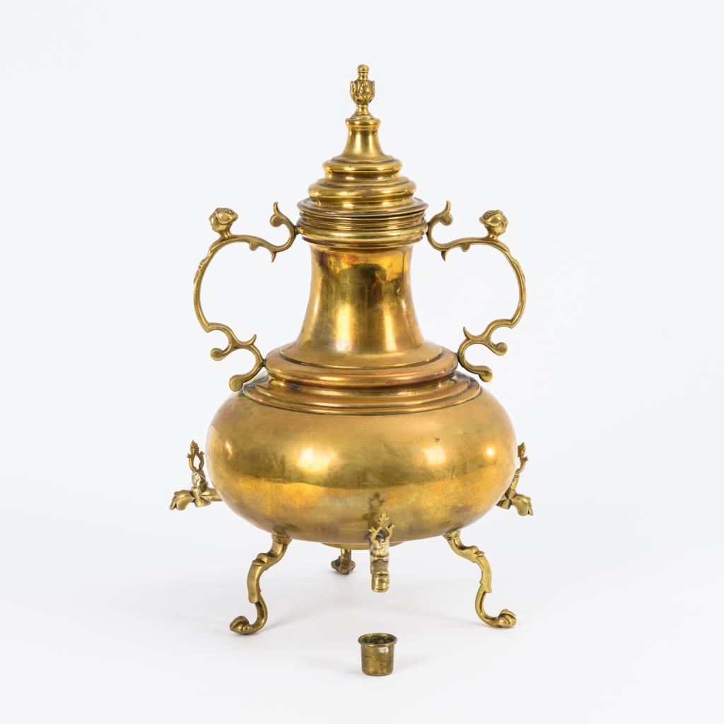 Kugelförmiges Gefäß mit 3 geschweiften Beinen, 2 Rocaillen-Henkel mit Frauen-Protomen am hohen Hals sowie gestufter Passdeckel. Dazu ein kleiner Becher. Ansätze der Hähne und Henkel nachgelötet, Deckel gerissen und alt repariert.